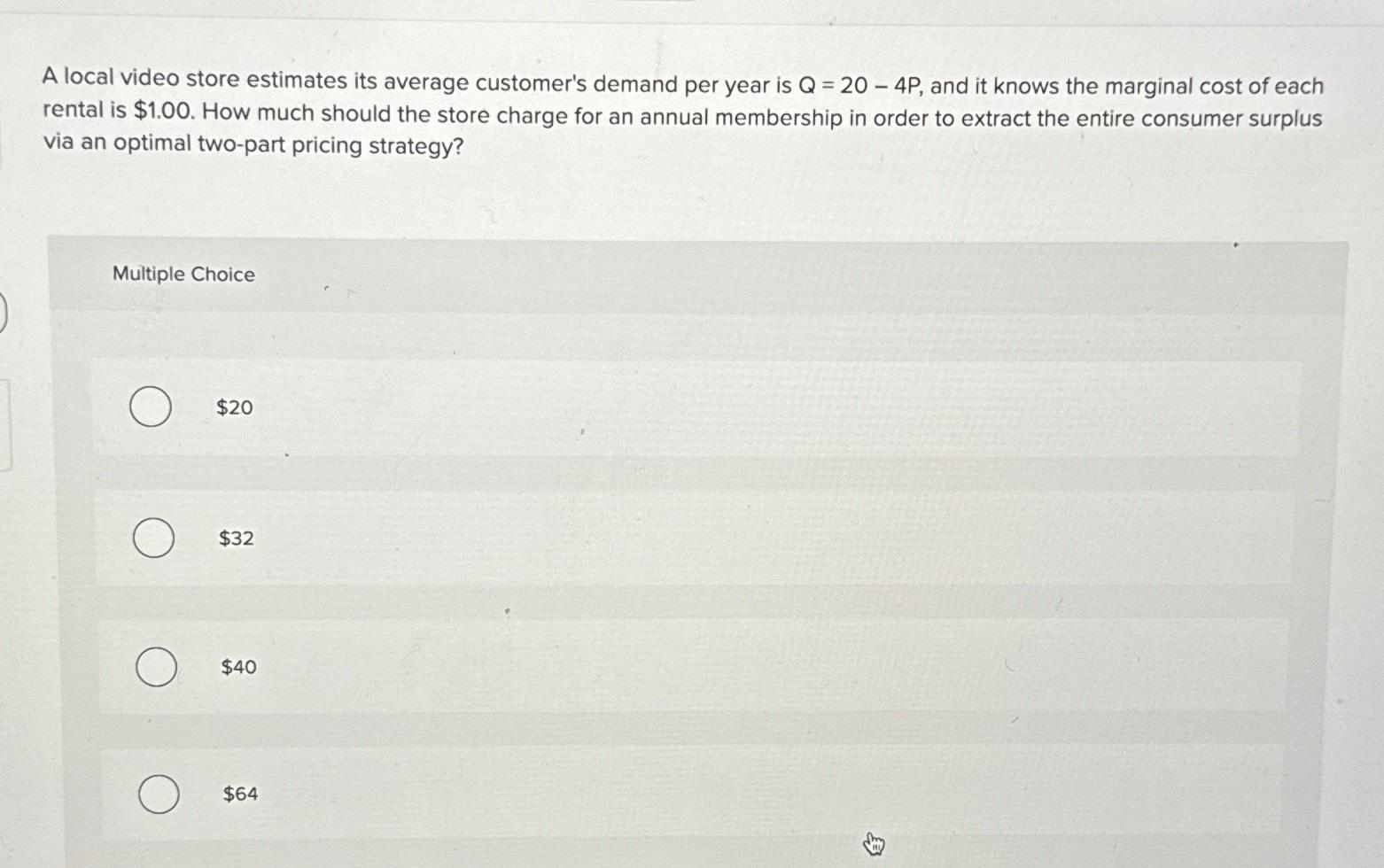 a local video store estimates its average customer's demand per year is q = 20 − 4p, and it knows the marginal cost of each rental is $1.00. A local video store estimates its average customer’s demand per year is q = 7 − 2p, and it knows the marginal cost of. It knows the marginal cost of each rental is. How much should a store charge for an annual membership in order to extract the entire consumer surplus from. a local video store estimates its average customer's demand per year as follows.